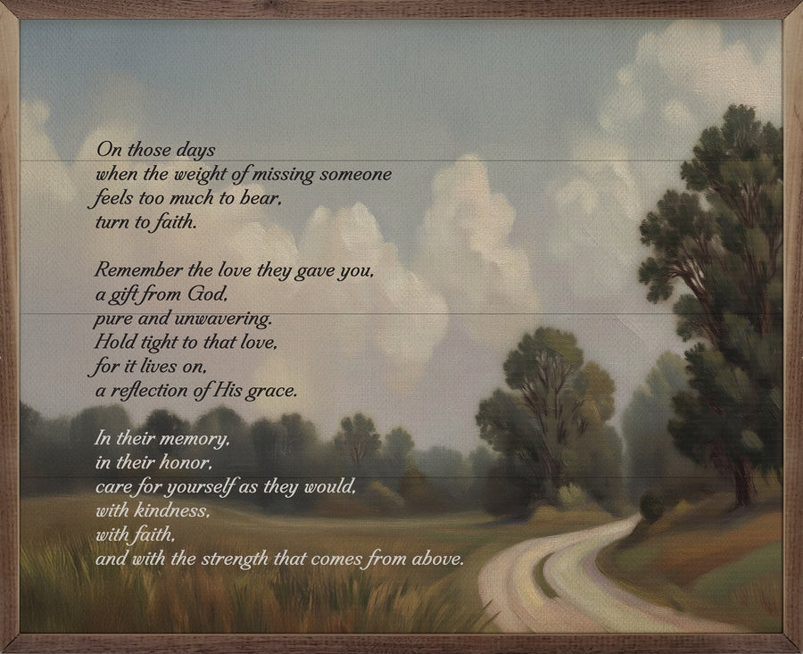 Honor cherished memories with the timeless beauty of our Kendrick Home walnut-framed memorial art collection. Thoughtfully designed to celebrate love, remembrance, and enduring connection, each piece features heartfelt expressions framed in rich walnut for a warm, rustic elegance. A meaningful addition to any space, these pieces offer comfort and serenity while keeping the spirit of loved ones close.
